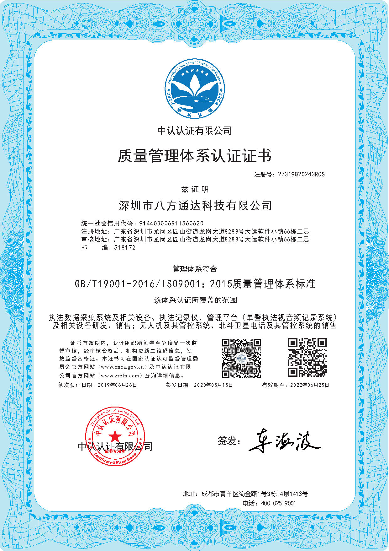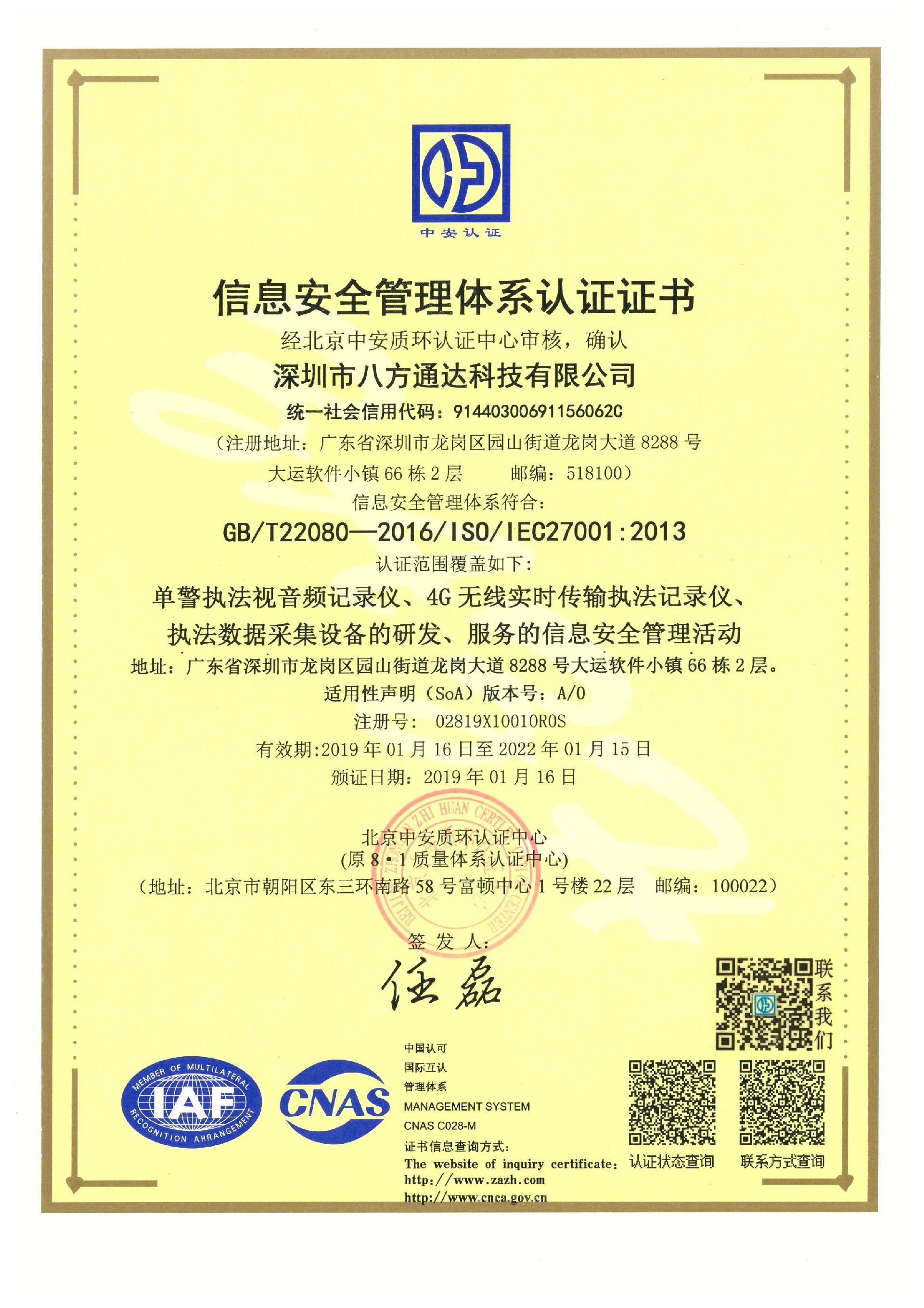 企業通過ISO270001、20000、安防工程一級資質、商品售后服務體系、知識產權貫標等多項資質審查與中國電子科技集團第五十四研究所在技術研發上達成深度戰略合作