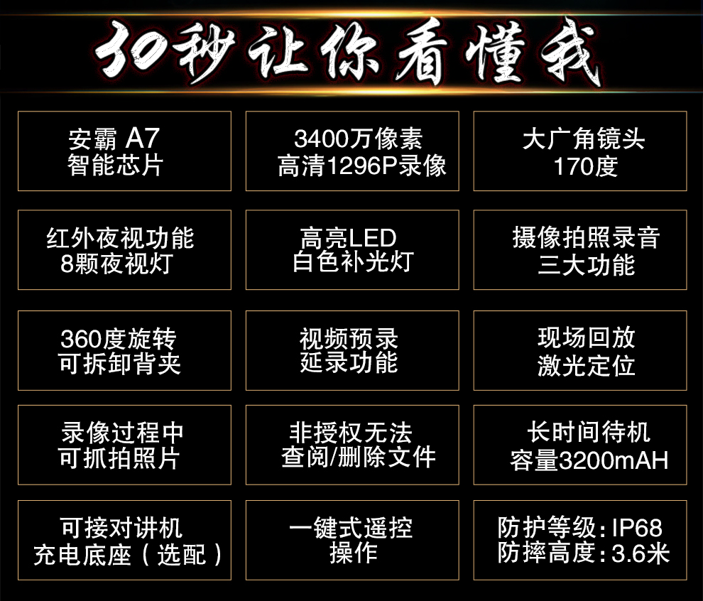產品功能:紅外夜視;循環錄影;外接攝像頭;防水;防摔;防塵